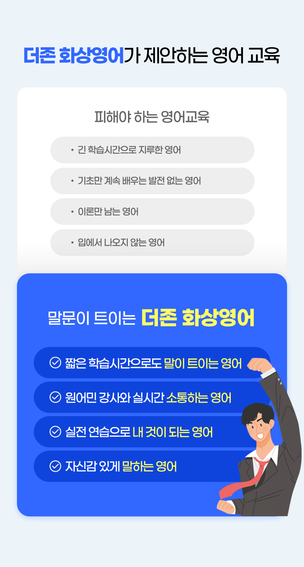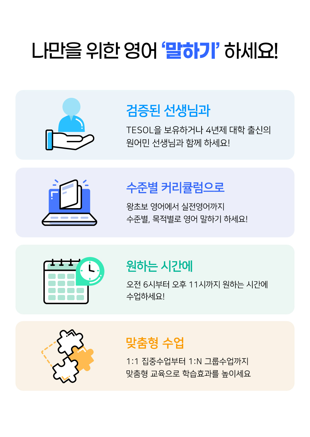 걱정하지 마세요! 첫수업은 레벨테스트로 진행되어 강사님과 간단한 대화와 테스트를 통해 본인 영어실력에 적합한 과정으로 배정을 도와드립니다.